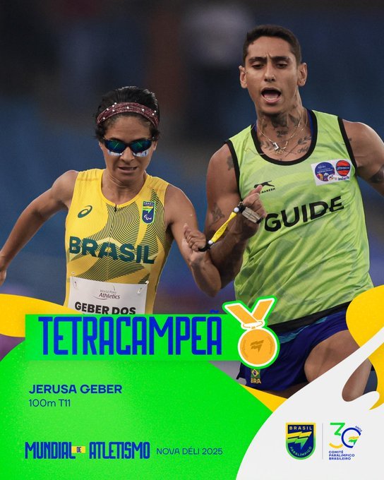 O tetracampeonato da velocista Jerusa Geber foi o grande destaque do Brasil nesta quarta-feira (1º) no Mundial de Atletismo Paralímpico, realizado em Nova Déli, Índia. A acreana venceu a prova dos 100 metros T11 (deficiência visual) com o tempo de 11s81, garantindo seu quarto título mundial consecutivo — após triunfos em Dubai (2019), Paris (2023) […]