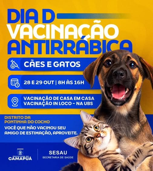 A Prefeitura de Camapuã, por meio da Secretaria Municipal de Saúde (SESAU), realiza nos dias 28 e 29 de outubro o Dia D de Vacinação Antirrábica no distrito da Pontinha do Cocho. A ação acontece das 8h às 16h, com equipes percorrendo as residências e também realizando a vacinação na Unidade Básica de Saúde (UBS) […]
