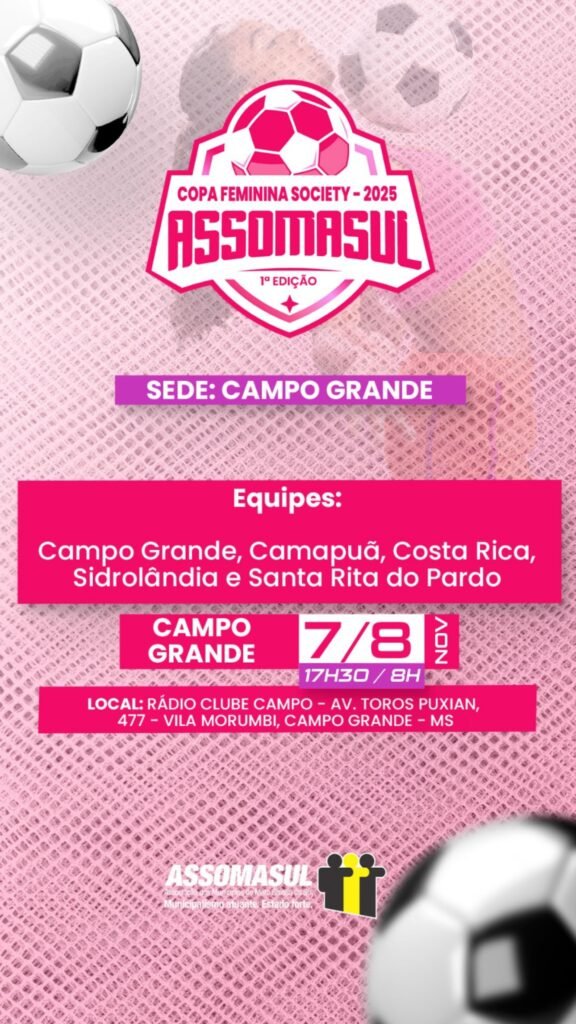A 1ª Copa Feminina Society da Assomasul será realizada nesta quinta e sexta-feira, dias 7 e 8 de novembro, em Campo Grande, marcando um momento histórico para o esporte municipalista em Mato Grosso do Sul. A abertura oficial acontece no Rádio Clube Campo, às 17h30, localizado na Avenida Toros Puxian, nº 477, Vila Morumbi. O […]