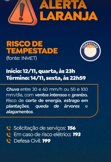 A Defesa Civil Municipal de Campo Grande informa que o Instituto Nacional de Meteorologia (INMET) emitiu Alerta Laranja para risco de tempestades na Capital. O aviso meteorológico teve início às 23h desta quarta-feira (12) e segue válido até sexta-feira (14), às 22h59. De acordo com o INMET, há previsão de chuvas intensas, com volume entre […]