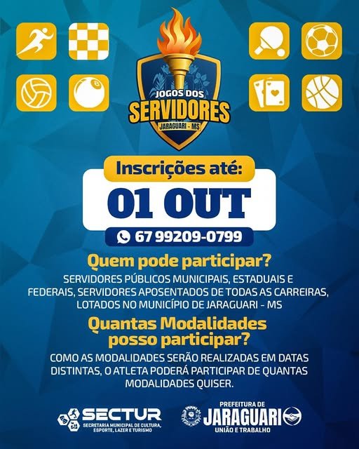 A Prefeitura de Jaraguari, por meio da Secretaria Municipal de Cultura, Esporte, Lazer e Turismo (Sectur), abriu inscrições para os Jogos dos Servidores 2025, um evento que promete reunir servidores públicos em uma grande confraternização esportiva. As disputas serão realizadas em várias modalidades, contemplando desde esportes coletivos até atividades individuais. Entre elas estão: Atletismo corrida: […]