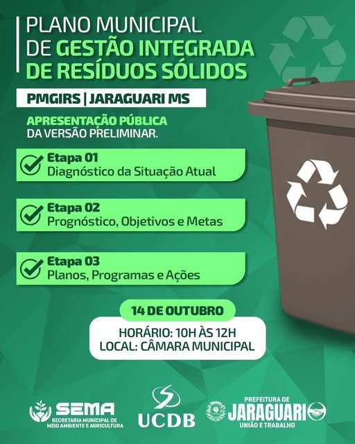 Jaraguari realiza apresentação pública do Plano Municipal de Gestão Integrada de Resíduos Sólidos dia 14 de outubro