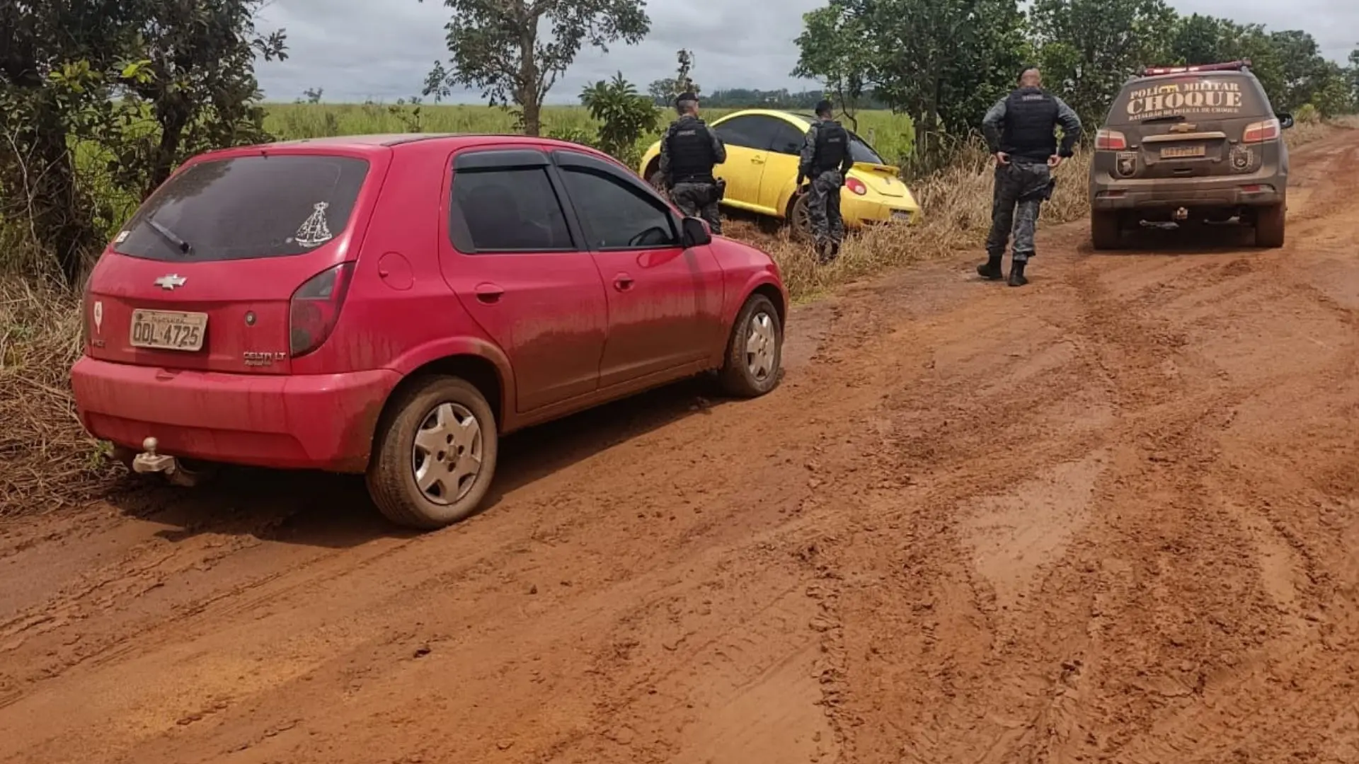 Após o crime, os suspeitos fugiram pela BR-163 em direção ao distrito de Anhanduí. Equipes da Polícia Militar localizaram os veículos e iniciaram uma perseguição. O Celta acabou sendo interceptado e duas pessoas foram presas: uma mulher de 39 anos e um jovem de 18.