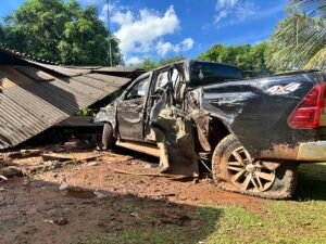 Ao realizar uma conversão à esquerda, o condutor perdeu o controle do veículo, que saiu da pista e colidiu violentamente contra uma residência. O impacto só não foi maior porque uma árvore conteve parcialmente a caminhonete, mas ainda assim o veículo atingiu o quarto e a varanda do imóvel, causando danos estruturais.