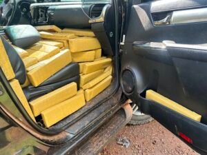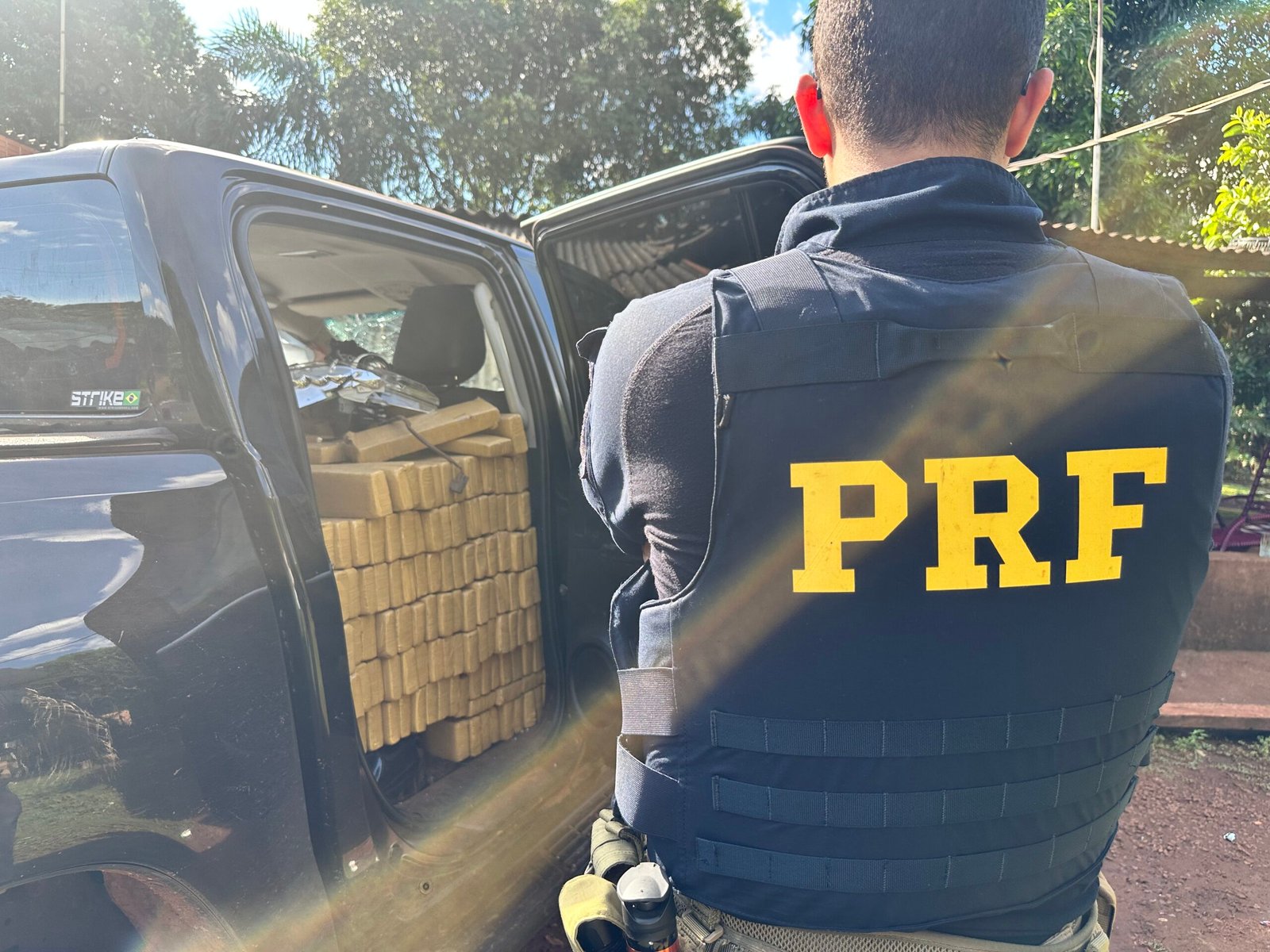 Segundo a PRF, dentro da caminhonete, que estava com placa fria, foi encontrada uma grande quantidade de entorpecentes, possivelmente maconha. A informação foi confirmada pelos agentes no local e há registro fotográfico da apreensão.